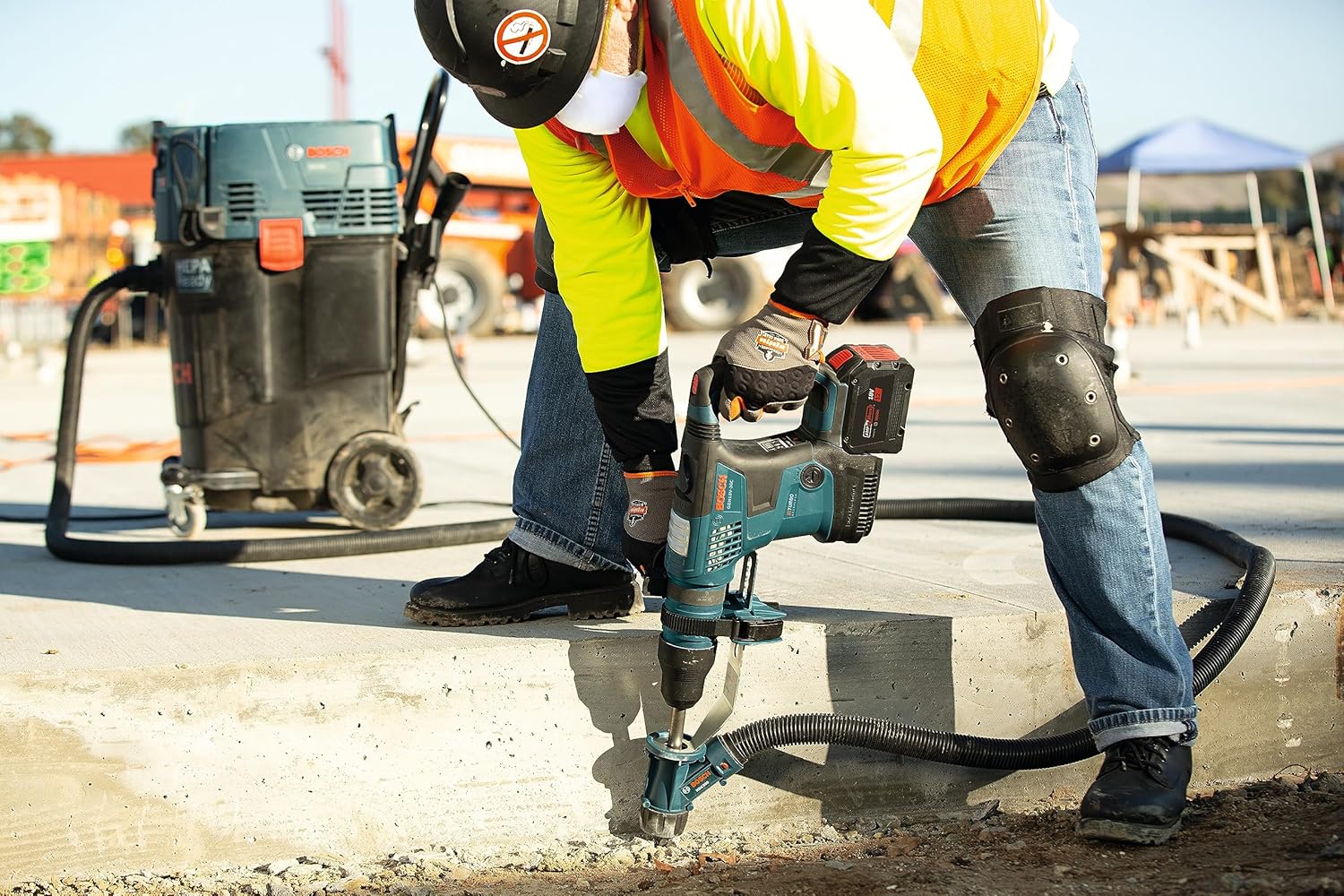 This 18V SDS-max® 1-9/16 In. rotary hammer is powerful enough to provide corded-type performance for tackling heavy-duty concrete drilling or chiseling jobs. The Bosch GBH18V-36C Rotary Hammer delivers 5.2 Ft.-Lbs. of impact energy (EPTA). That is unprecedented for a single 18V battery-driven SDS-max® 1-9/16 In. rotary hammer. It weighs 13.4 Lbs. (with included battery). This hammer is part of the PROFACTOR™ System, which pairs BITURBO Brushless™ Technology with a CORE18V® High Power Battery. BITURBO Brushless™ Technology is a high-performance motor and drive-train system designed to deliver power comparable to high-demand corded tools. The anti-vibration system features a longer air cushion in the hammer tube and dampeners in the handle The hammer has KickBack Control, rotary hammer and hammer-only modes, a reverse setting and Vario-Lock to rotate and lock the chisel. The hammer features an on-tool user interface for tool performance, feedback and control. This hammer features connectivity (module sold separately), providing a link to the free Bosch Toolbox app on a connected device to customize settings. The kit includes two CORE18V® 8 Ah High Power Batteries, which each deliver 50% more runtime and over 75% more power than the CORE18V® 4 Ah battery, powering high-demand applications. The kit has a battery turbo charger, which provides 16-amp charging current for fast and faster charging, with an optional Power Boost™ mode.