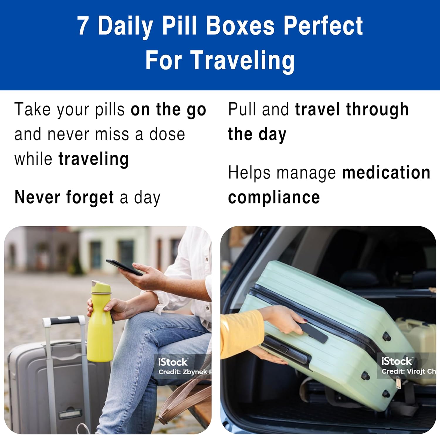 This compact nylon travel kit includes seven large capacity pill boxes (marked with the days of the week) in a convenient and durable nylon case. The MedCenter traveler XL fits conveniently in a carry on or suitcase. The traveler XL also works directly with the MedCenter talking alarm clock (sold separately) to create a weekly organizer and reminder system. Velcro flap allows for quick access to pill boxes holds up to seven large capacity pill boxes for up to one full week of medication compact size saves space in desk drawer, carry-on luggage or suitcase includes seven large capacity pill boxes numbered with each day of the week four cavities in each included pill box our new larger XL pill boxes.