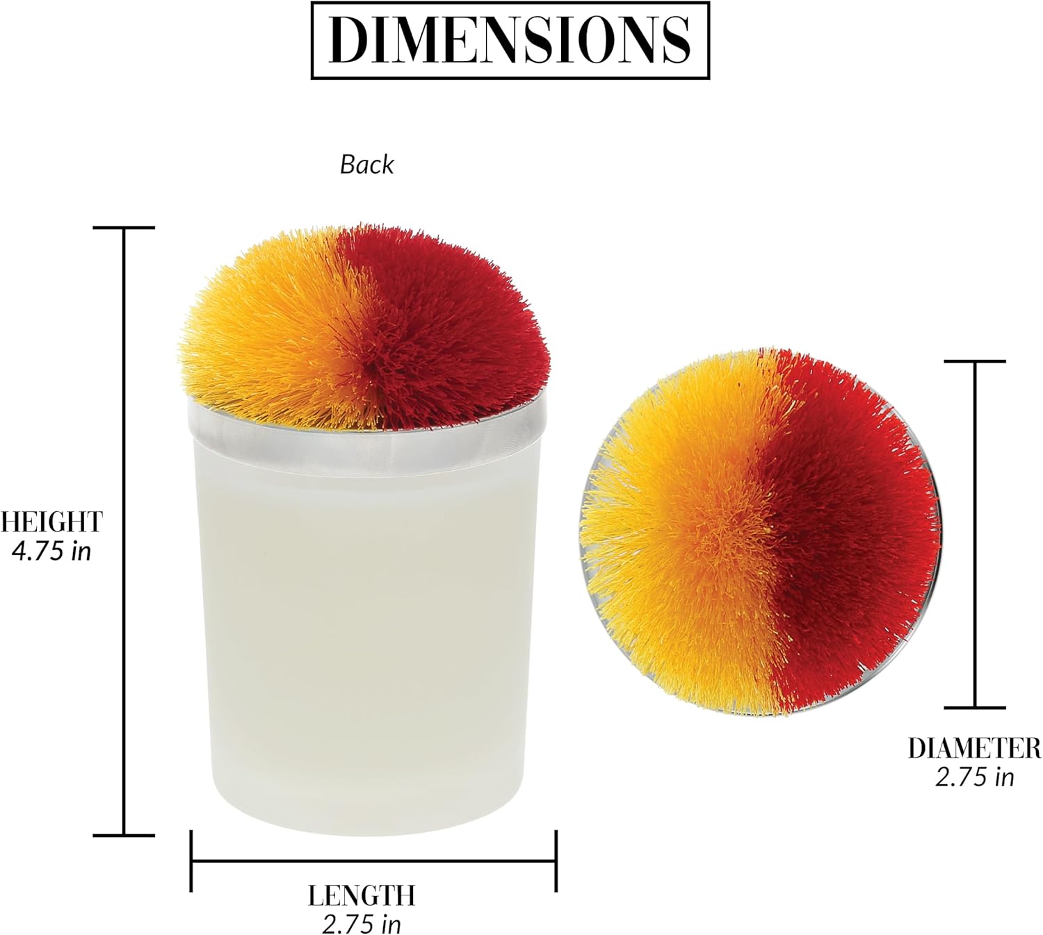 The Pavilion 5.5 oz Glass Frosted White Glass Single Wick Candle, adorned with a vibrant Red & Yellow Pom Pom Lid, stands out for its premium quality and stylish design. This 2.75" wide and 3.5" tall frosted glass vessel contains 5.5 oz of 100% floral tranquility-scented soy wax, complemented by a single lead and nickel-free cotton wick for a clean and delightful burn. The smooth bottom ensures a gentle placement on any furniture surface, and the metal lid, featuring a silicone band for a snug fit, boasts a playful red and yellow pom pom design, with the option to mix colors at the center. The candle's simplistic style seamlessly integrates into the home decor of sports enthusiasts during game seasons. A perfect gift for fans of various college, high school, and professional sports leagues, it adds a touch of celebration to game nights with friends and family. Care instructions guarantee optimal performance, and the candle is elegantly packaged in a decorative die-cut box, with the lid securely stored inside a plastic and cardboard header. As part of Pavilion's diverse collection, this candle is one of four frosted glass vessel styles, accompanied by 25 pom-pom style lids representing a variety of college, high school, and professional league football, basketball, baseball, hockey, soccer, and football themes.