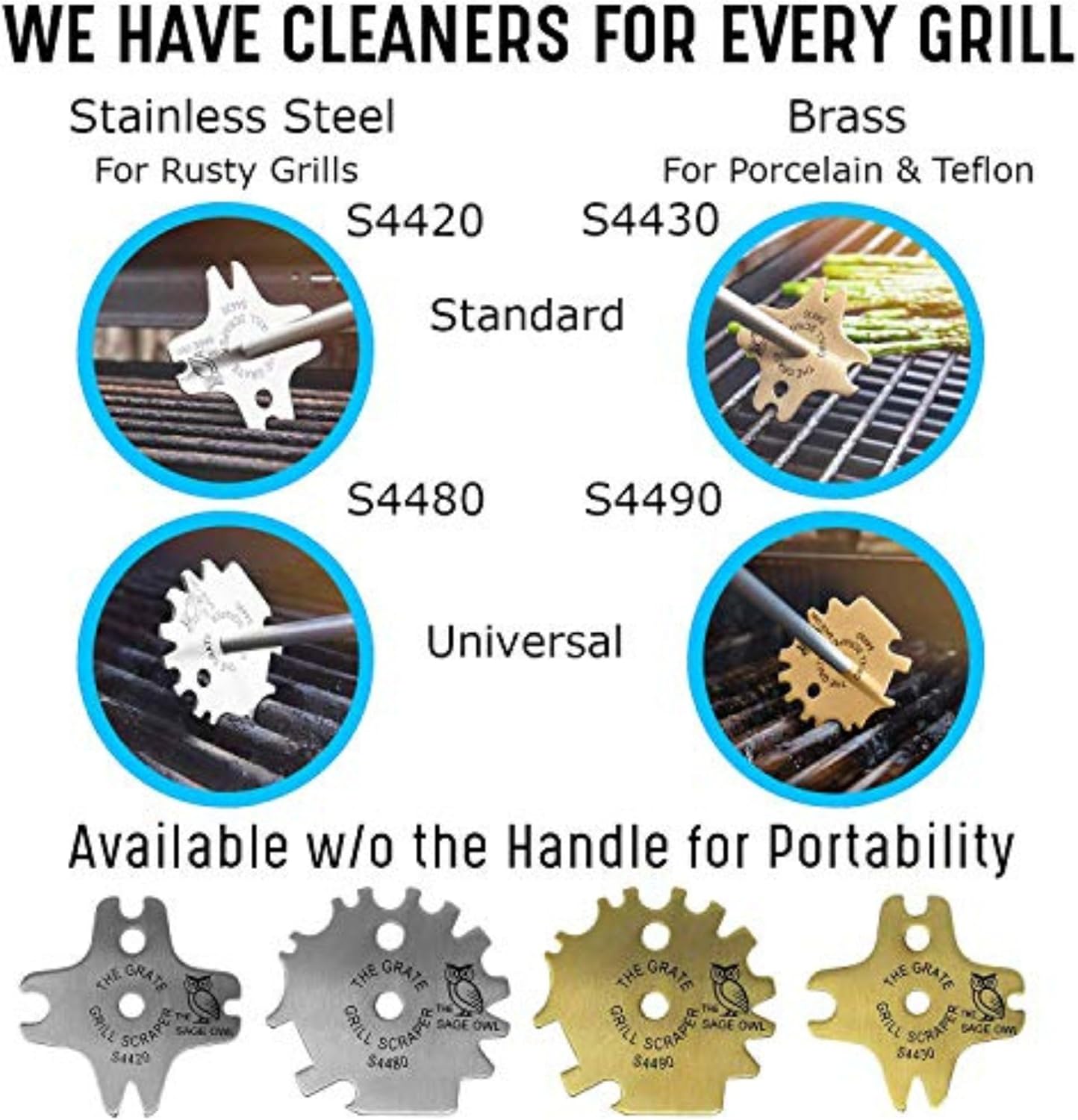 Combination Pack | Quantity: 1 each | Individually Packaged Sizes: S4420 & S4480 | Material Type: Stainless Steel Get your BBQ grill clean as a whistle - without dangerous stray wire bristles. Rusty, filthy grill grates can lead to foul-tasting and potentially contaminated food. But Wire Brushes Often Shed Their Bristles, which can then wind up in your meat. So, what’s the solution? It’s The Sage Owl Grill Scraper in Stainless Steel. This package comes with the 2 in 1 barbecue tool and the 5 in 1 BBQ tool that Work With Most Any Design, Brand, And Style Of GrilL, featuring a combined total of 9 notches for round grates, 6 notches for V-shaped grates, & 3 notches for park & campground grates (5 in 1) (fits BBQ grills in most state & national parks & campgrounds). We even included a grill pan cleaner, griddle cleaner & bottle opener for added convenience. Just a few quick passes over your grate removes built-up grease, charred meat, & other debris, Leaving A Smooth And Clean Surface that’s ready for your juiciest, most expensive cuts of meat. ►Universal Design ►Bristle-Free - Safer than Grill Brushes ►Compatible with Round, V-shaped and Square Grates ►Heavy-Duty Stainless Steel Construction Lasts Longer Than Wooden Scrapers ►Small Size Lets You Take it Anywhere ►Included Accessories - Bottle Opener, Griddle Cleaner, Hanging Hook & Chain The Sage Owl Grill Scraper Works Just As Quickly As A Wire Brush, yet is safer for use around food. The Brass tool is 100% Safe To Use on Porcelain & Teflon-coated grills. Fits A Wide Variety Of Grills: ►Weber ►Charcoal ►Infrared ►Gas ►Wood Pellet ►Indoor Ovens These 2 Grill Grate Scrapers covers all your Grill cleaning needs. Can be funny stocking stuffers, or women stocking stuffers for Christmas.
