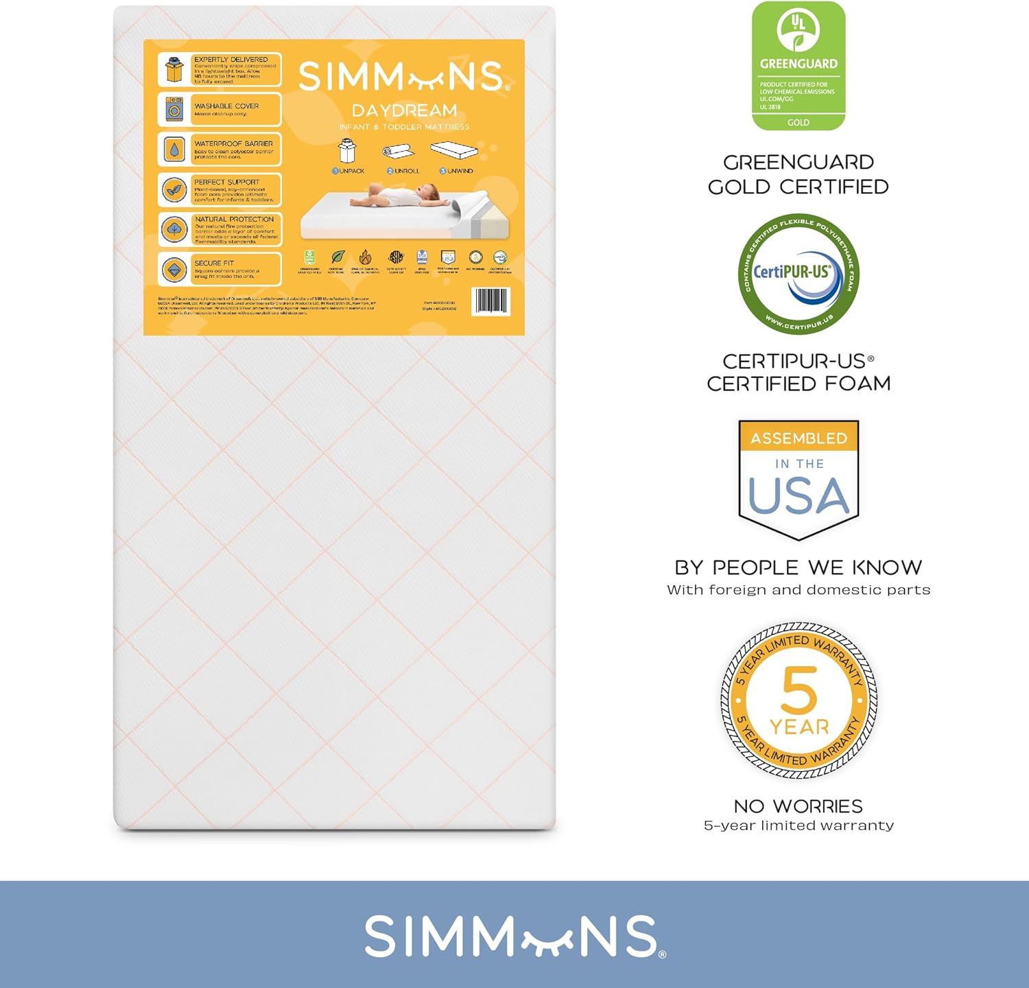 Simmons Kids Daydream 2-Sided Crib and Toddler Mattress GREENGUARD Gold Certified, CertiPUR-US Certified Foam, Breathable Machine Washable Cover, Waterproof Barrier, Made in USA, White